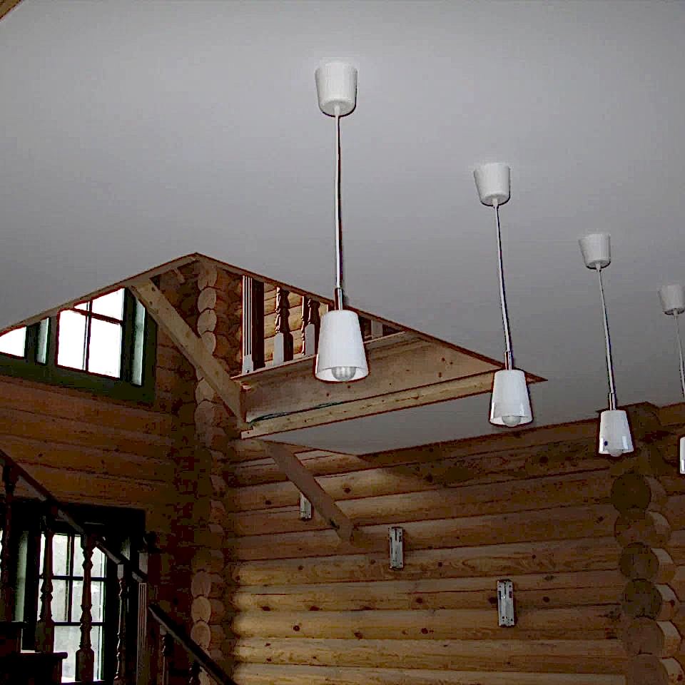 Частные дома из бруса и Pin-Up дают усадку, из-за чего на потолочном полотне могут появиться морщины и складки. По этой причине рекомендуется устанавливать потолок минимум через год после завершения строительства.