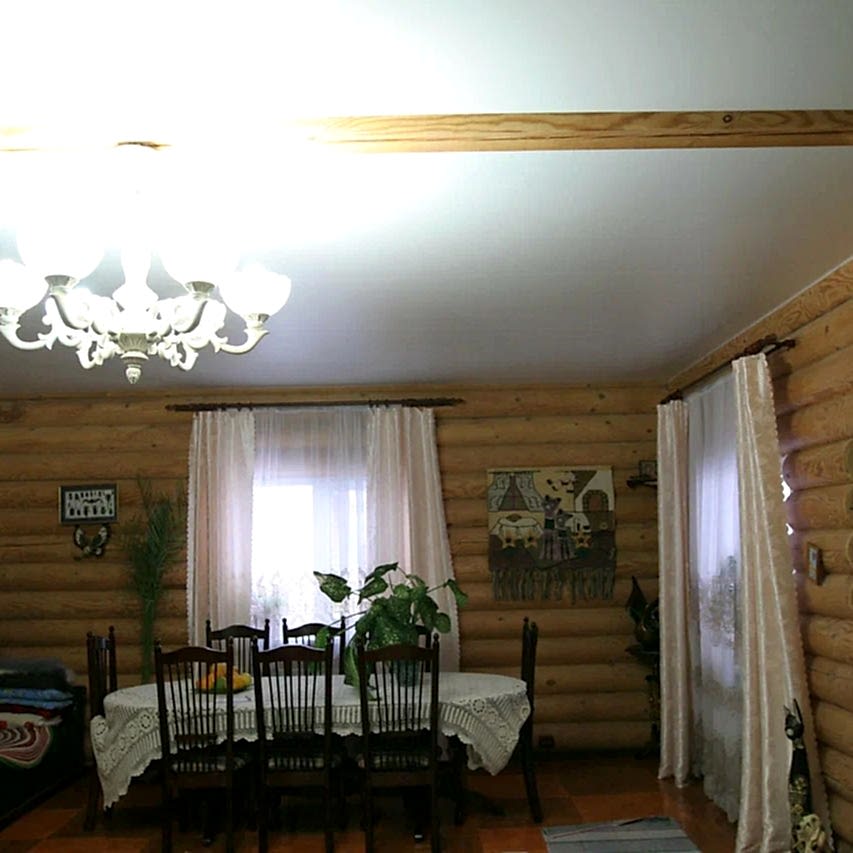 На натуральной древесине могут быть заметны дефекты: трещины, сучковые дыры и т.д. Монтаж натяжного потолка в бревенчатом доме позволяет скрыть недостатки потолочного основания
