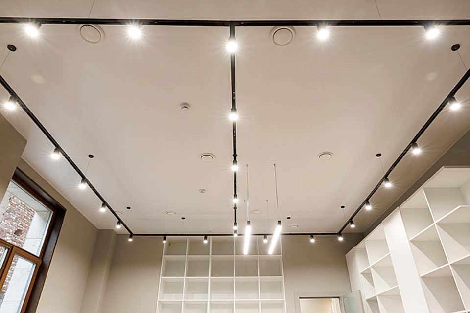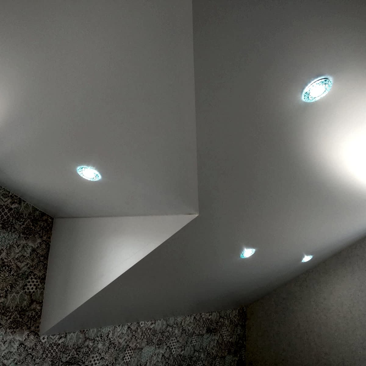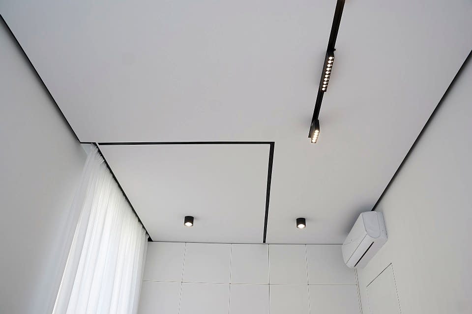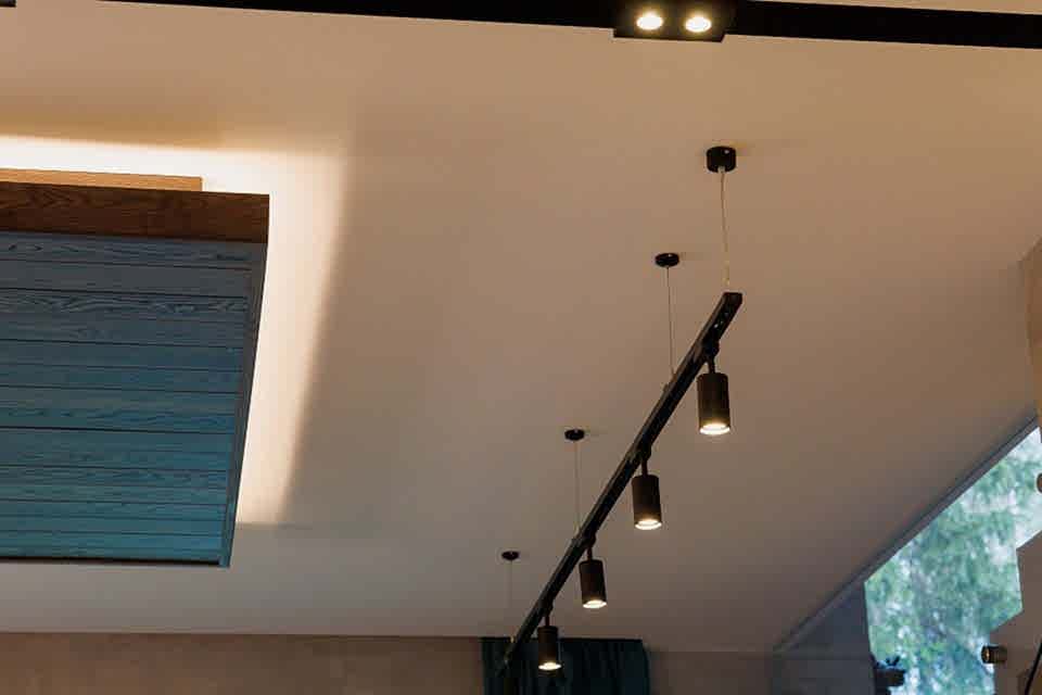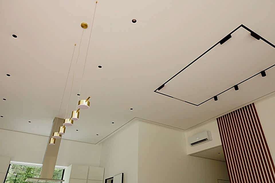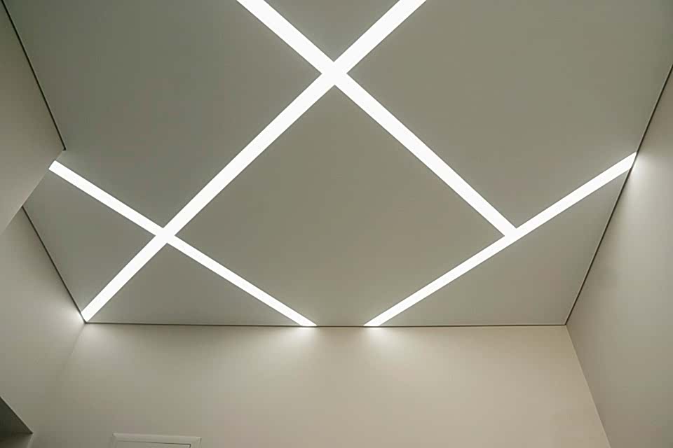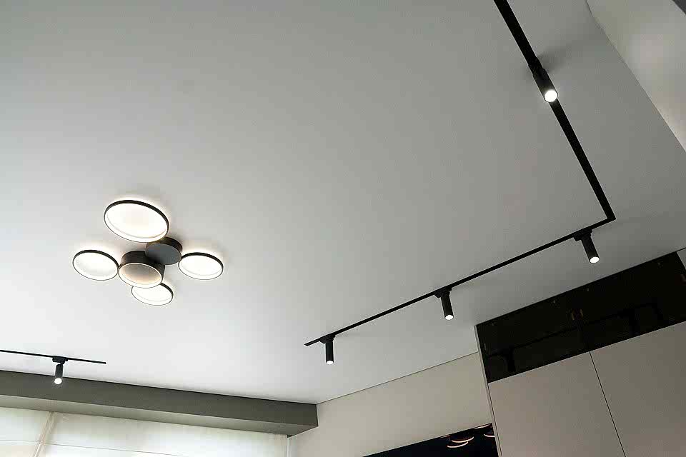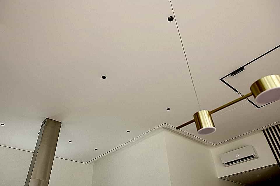 Многообразие цветов и фактур позволяет выбрать полотно для любого помещения. В результате получается ровная поверхность, которую не нужно красить или штукатурить. В конструкцию могут быть Pin-Up светильники, датчики сигнализации, вентиляционные решетки.