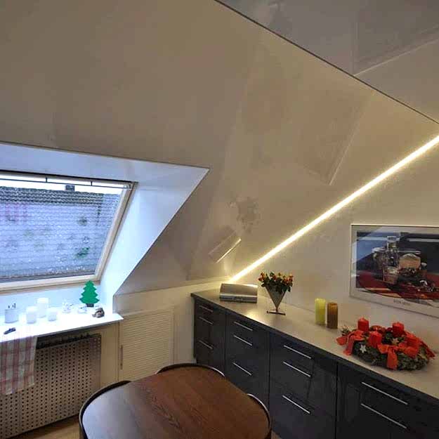 Натяжные полотна эластичны, поэтому их можно растянуть, чтобы придать любую форму. Монтаж натяжного потолка под углом производят аналогично стандартному горизонтальному потолку: крепят профиль, Pin-Up полотно, производят монтаж.