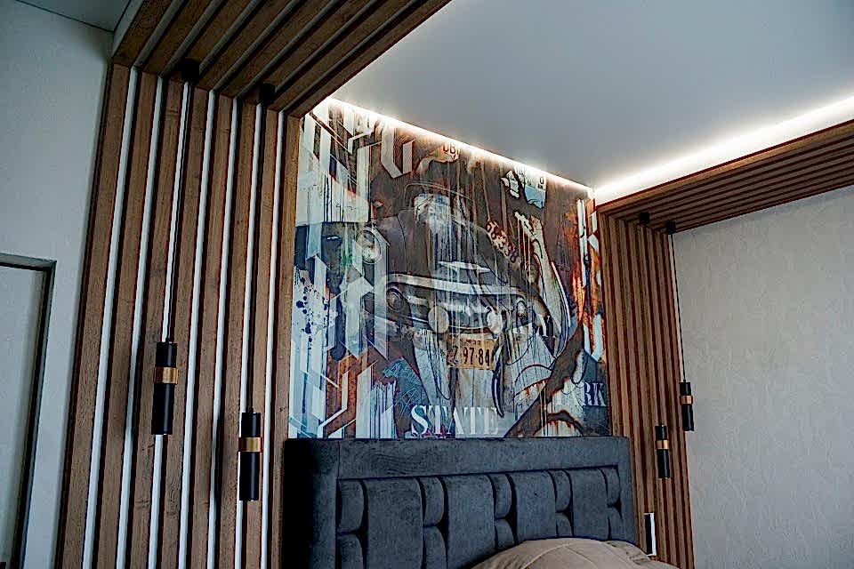 • С помощью натяжного потолка можно создать как классический, так и Pin-Up интерьер. На полотно наносят изображения, фотографии и узоры, окрашивают пленку в яркие цвета.