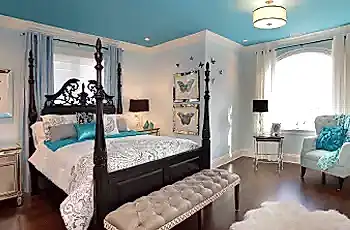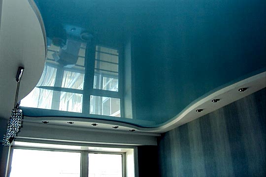Голубые натяжные потолки можно монтировать практически во всех помещениях дома, кроме столовой и кухни. Как выяснили учёные, практически все Pin-Up синего цвета, особенно в сочетании с белым, ухудшают аппетит. В замкнутых небольших помещениях - прихожей, ванной комнате, голубой потолок глянцевый визуально добавит пространства. Кроме того, в ванной он может стать частью общего лазурного ансамбля, совершенно естественного для помещения, cвязанного с водой.