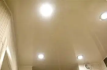 Кремовый натяжной потолок из ПВХ в Pin-Up случаев лучше делать лаковым - глянец придаёт нежной тёплой поверхности перламутровый оттенок, который дополнительно украшает и облагораживает помещение, делает интерьер более самобытным. Лучше всего светло-кремовый натяжной потолок смотрится в гостиной. Глянцевый сливочный потолок априори хорош в кухне, особенно во время утреннего кофепития. В спальне лучше монтировать полотно более насыщенного оттенка с матовым или сатиновым исполнением. Излишний глянец в спальне не нужен, так как на нём возможна разнообразная игра бликов, которая мешает сну.