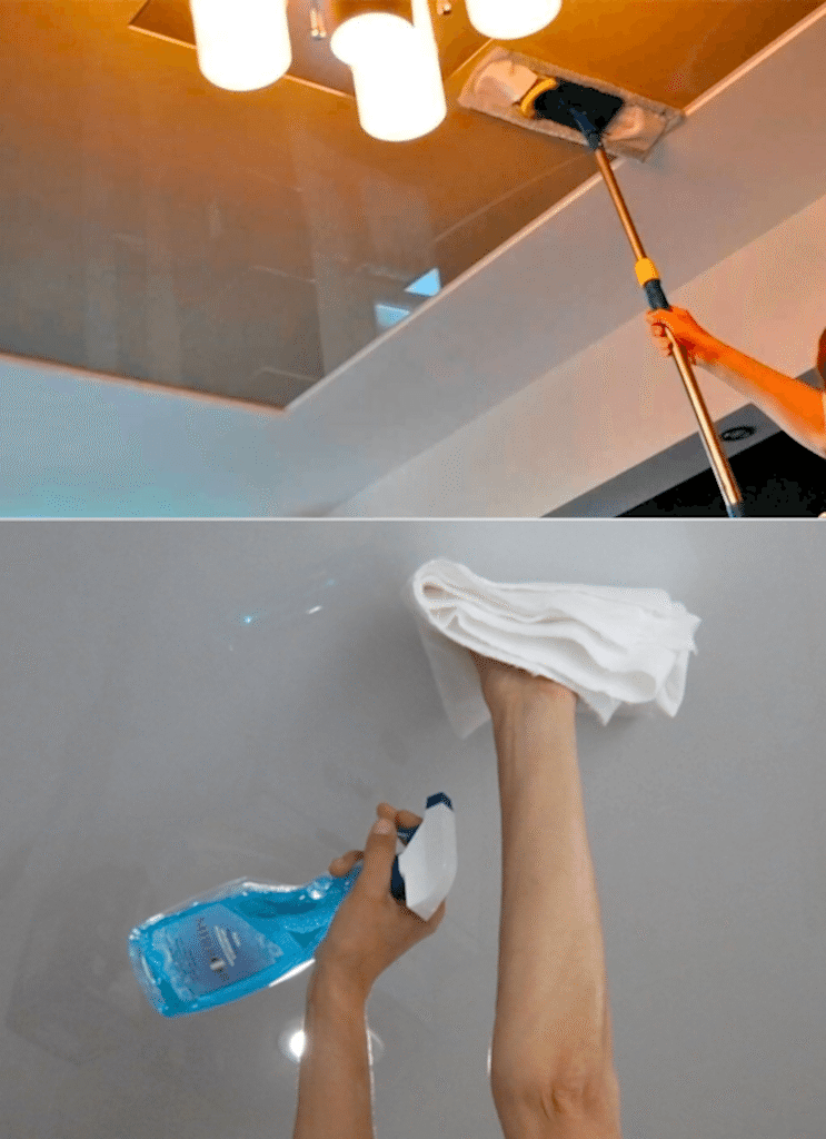 Лаковые полотна после основной очистки Pin-Up обработать водкой или нашатырным спиртом, разбавленным водой в пропорции 1 к 10. Для предотвращения разводов на глянцевой поверхности, потолок нужно протереть сухой тканью из микрофибры.